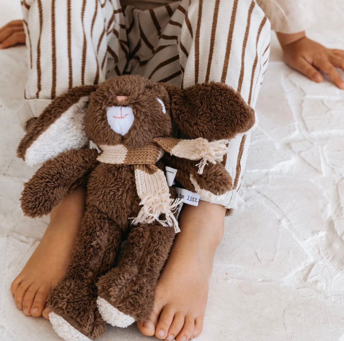 Frankie rabbit is made with chocolate brown super soft plush fabric and wears an Australian merino wool scarf. He is super soft and is the cuddliest friend around.