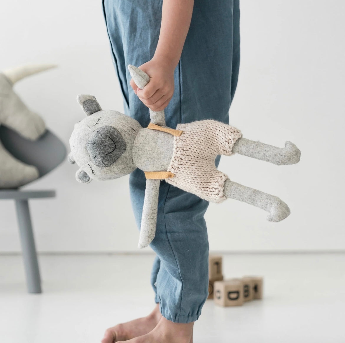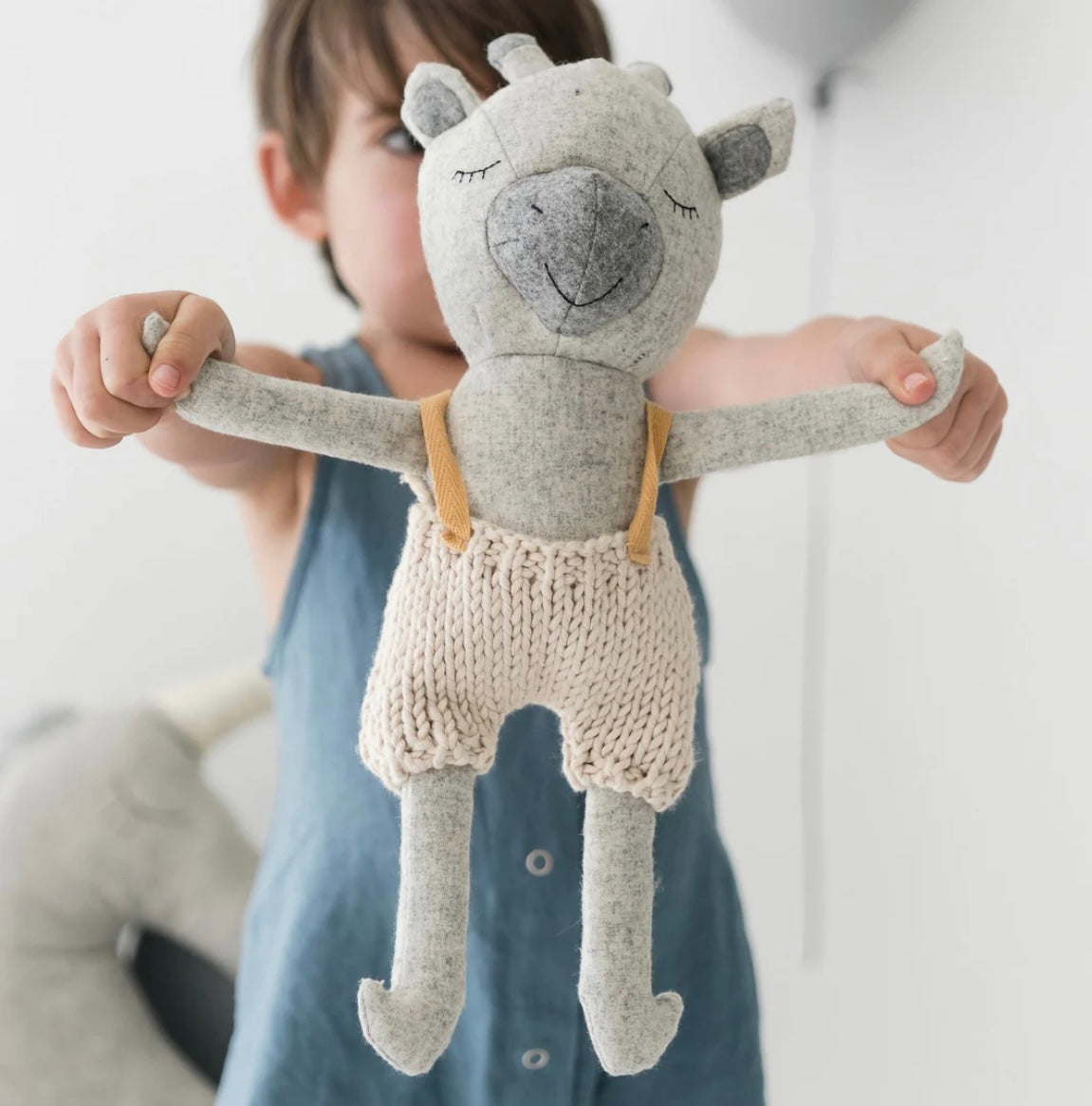 Made with the softest wool blend fabric, Rudy wears hand knitted Australian merino wool cream overalls with mustard straps