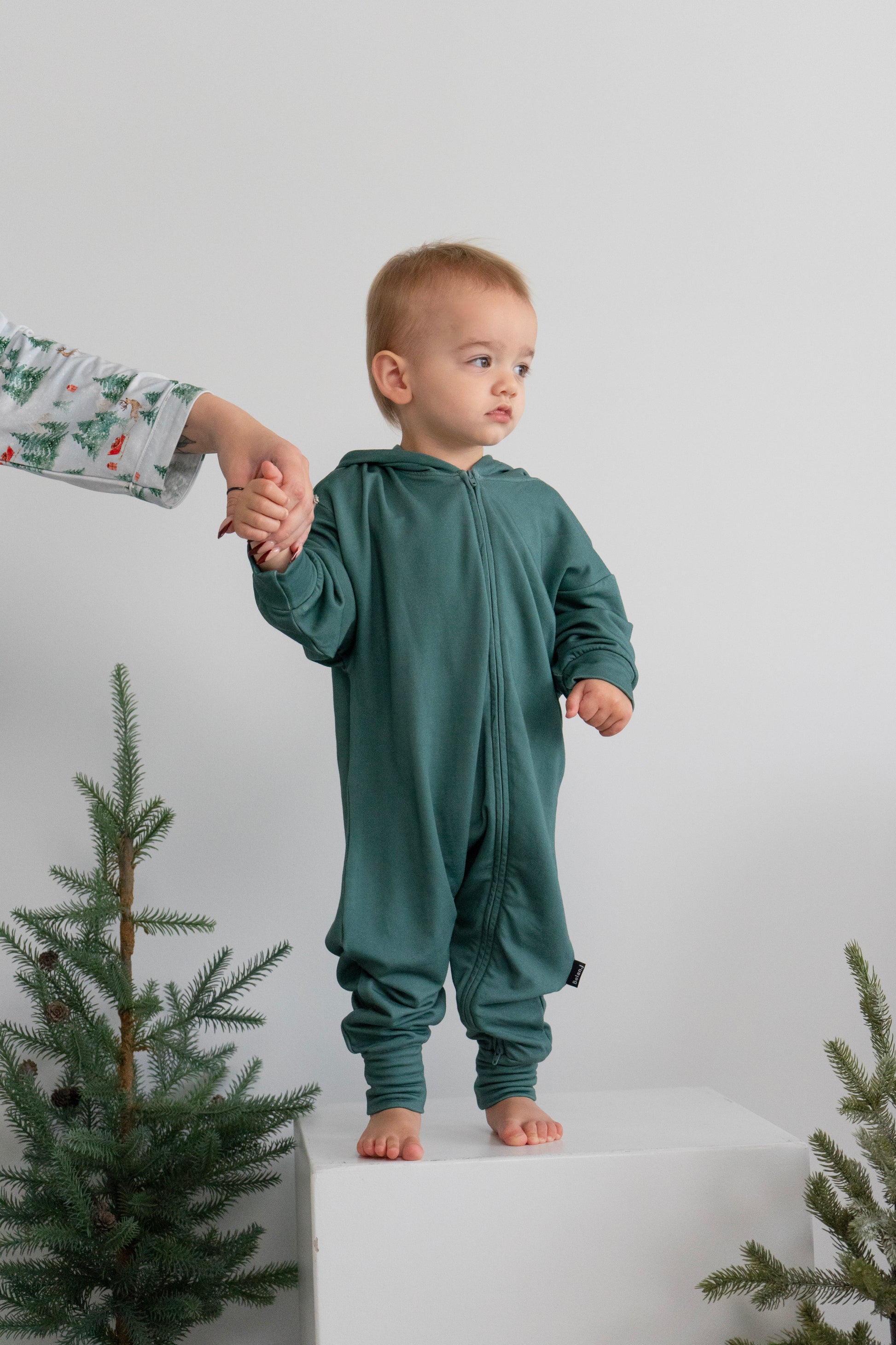 This hooded jumpsuit features a baggy fit to allow for layering and movement. With a zipper from neck to ankle, getting this off and on your little one is a breeze. The lined hood makes this romper extra cozy during cooler months.