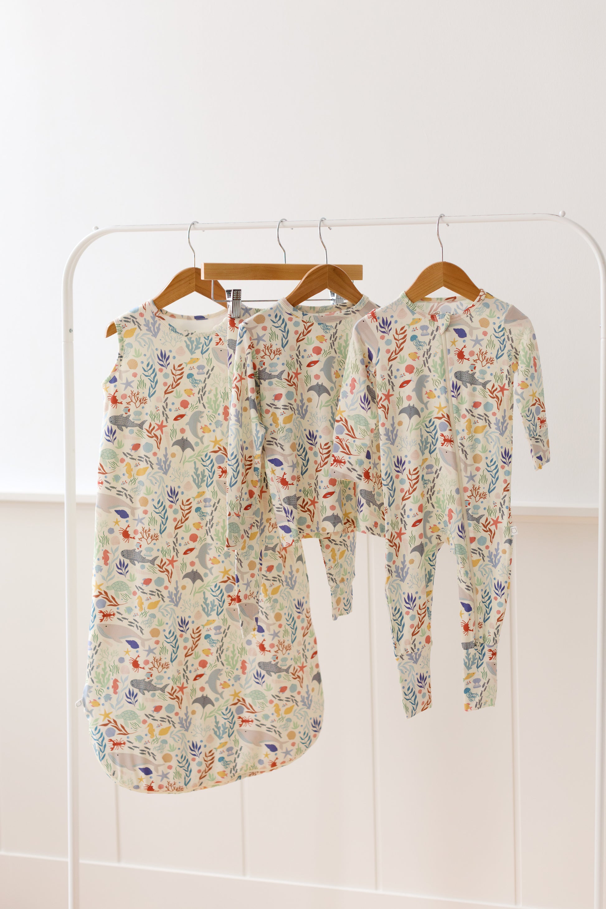 Inspired by the magic of the ocean, this collection brings a calm, coastal feel to everyday cozy. Made from Roobear’s signature buttery-soft bamboo, the hand-drawn print features a blend of soft aqua, ocean blue, and sandy neutrals — an easy, timeless palette that feels like a deep breath by the sea.