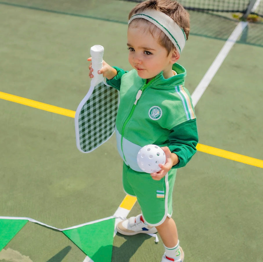 High-neck jacket with a zipper closure, featuring color blocks in green, dark green, and light blue. Designed with long sleeves, dropped shoulders, and ribbed knit cuffs and hem. Made from soft French Terry your little ones are sure to love.