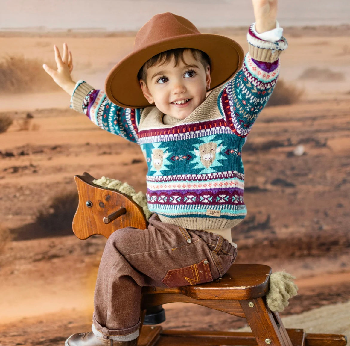 Beige knit sweater with Western-inspired patterns. The crew neckline, hem, and cuffs are rib-knit for a better fit. Designed with a regular fit for maximum comfort.